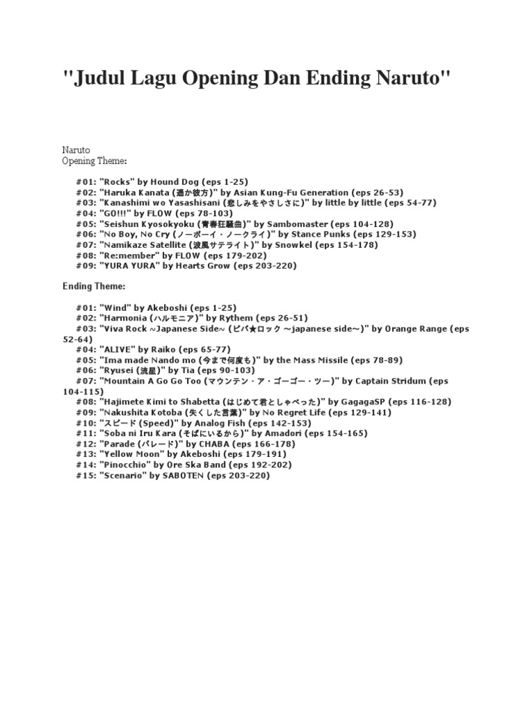 Kumpulan judul lagu opening naruto kecil 1. Selain itu sayapun menyediakan format rar khusus bagi kalian yang ingin mendownload seluruh lagunya secara otomatis dalam 1 kali klik. Bareng sama ending baru juga nihnih liriknya.
